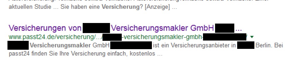 passt24 holt sich die Versicherungskunden oder Interessenten, die einen Vermittler suchen, zunächst auf ihre Seite. Ein Link von passt24 wird einfach um den Namen des Maklers ergänzt und schon landet man mit einer Google-Suche des Maklers auf dem Portal von passt24. Die Google-Übersicht zeigt in der Überschrift deutlich die Firmenbezeichnung des gesuchten Maklers und der Nutzer betrachtet dies als einen Treffer zu seiner Suche. Bei der Suche nach dem Makler XYZ wird ein vollständiges Ergebnis mit dem Namen und der teilweisen Adresse des betreffenden Maklers angezeigt. Die stichprobenartige Suche div. Makler hat das selbe Ergebnis gebracht.
