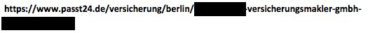 Tatsächlich wird aber die Seite von passt24 aufgerufen, in der der Makler mit seinem Firmennamen und seiner vollständigen Adresse eingebettet angezeigt wird. Rund um die Adressdaten des Vermittlers erscheinen dann die Angebote des Betreibers der Website. Ein Link zur eigentlichen Website des Maklers ist nicht vorhanden. Der Besucher der Seite wird nun unter den Kontaktdaten des Maklers aufgefordert: „Jetzt Versicherungen vergleichen und persönlich versichern“. Die Suche nach dem jeweiligen Makler oder seiner Website geht damit ins Leere und dem Nutzer wird irreführend vermittelt, dass es sich um die Website des Maklers handelt.