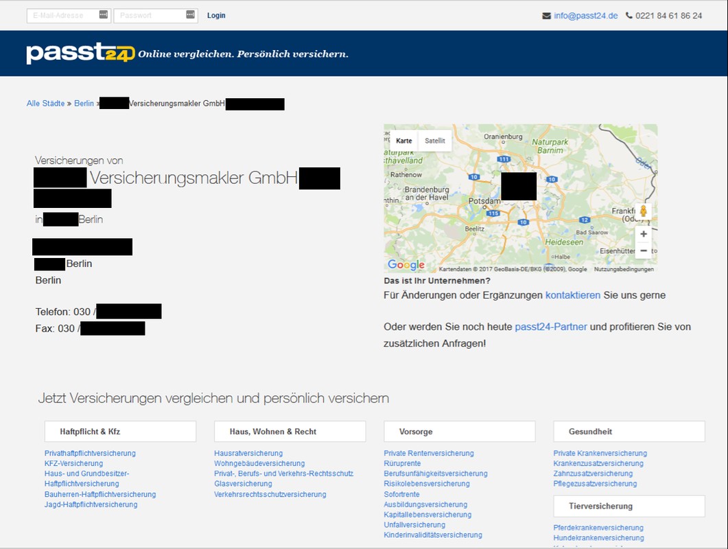 Wer tatsächlich Partner des Portals ist, kann nicht geprüft werden, da kein Verzeichnis der angebundenen bzw. kooperierenden Vermittler vorhanden ist. Über das Portal kann demnach nicht direkt nach einem evtl. Eintrag seines Unternehmens gesucht werden. Auch die Suche nach PLZ bringt kein Ergebnis, da sich der Nutzer des Portals zunächst mit seiner eMail-Adresse registrieren muss. Und spätestens hier bricht jede Verbindung zur eigentlichen Suche ab, es gibt keinen Zusammenhang mehr zwischen dem Suchbegriff über Google und der erforderlichen Registrierung mit der eMail-Adresse des Besuchers über das Portal passt24.