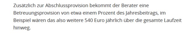 Darauf erhält der Vermittler zunächst eine Abschlussprovision von bis zu fünf Prozent. Die vorgerechnete Abschlussprovision von 2.700 Euro ist nahezu lächerlich im Verhältnis zu der dann vorgerechneten Betreuungsprovision: „Zusätzlich zur Abschlussprovision bekommt der Berater eine Betreuungsprovision von etwa einem Prozent des Jahresbeitrags, im Beispiel wären das also weitere 540 Euro jährlich über die gesamte Laufzeit hinweg“, berichtet FOCUS Online weiter.