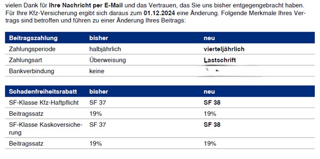 Bisher lief der Vertrag mit einer halbjährlichen Zahlungsweise. Zum 01.12.2024 hat der Kunde eine Umstellung auf vierteljährliche Zahlungsweise gewünscht. Aus dem bisherigen Halbjahresbeitrag in Höhe von 352,13 € wurden jetzt 252,49 € vierteljährlich.