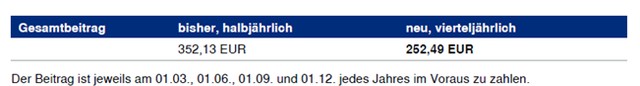 Im Ergebnis ändert sich der bisherige Jahresbeitrag in Höhe von 704,26 € (halbjährlich - 2 x 352,13 €) auf 1.009,96 € (vierteljährlich - 4 x 252,49 €). Berichtigt man den jeweiligen Jahresbeitrag um den enthaltenen (üblichen) Ratenzahlungszuschlag, so ergibt sich ein Jahresbeitrag von 683,75 € ohne Ratenzuschlag (3 %) bisher. Der neue Jahresbeitrag ohne 5 % Ratenzahlungszuschlag bei vierteljährlicher Zahlungsweise ergibt 961,87 €. Also einen Mehrbeitrag in Höhe von 278,12 € oder fast 41 %!