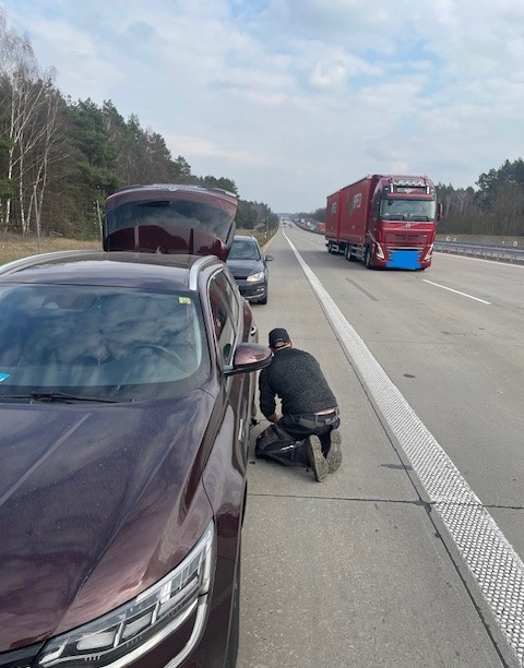 Gefühlte 30 Minuten später kam dann tatsächlich eine Hilfe. Aber mit einem Pannendienstfahrzeug hatte das wenig zu tun. Kein typisches Fahrzeug eines Pannendienstes, keine Warnleuchte, kein Warndreieck und ohne Wagenheber und Werkzeug. Der Helfer hat dann völlig risikoreich (natürlich auch ohne Warnweste) den Reifen gewechselt.