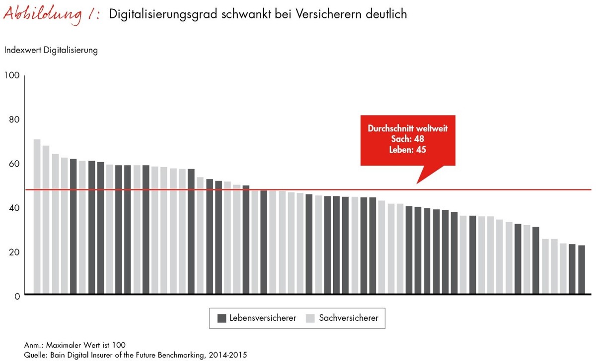 Weltweit kämpfen Versicherer mit Ausmaß und Geschwindigkeit der Digitalisierung. Laut dem „Global Digital Insurance Benchmarking Report 2015“ der internationalen Managementberatung Bain & Company fehlen noch rund 60 Prozent der Unternehmen zentrale Elemente für eine erfolgreiche digitale Transformation. Dazu gehören ein klares digitales Zielbild inklusive Fahrplan oder ein umfassendes Verständnis der Risiken.