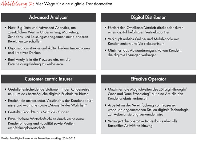 Basierend auf den Benchmarking-Ergebnissen hat Bain vier Wege identifiziert, die die befragten Versicherer für ihre digitale Transformation eingeschlagen haben (Abb. 2):
