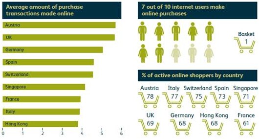 Im Rahmen einer Studie zu Inflationserwartungen europäischer und asiatischer Verbraucher fragte das Marktforschungsinstitut YouGov im Auftrag von M&G Investments unter anderem nach der Entwicklung des Online Shoppings. Betrachtet man alle beteiligten Länder (UK, Deutschland, Österreich, Frankreich, Spanien, Italien, Schweiz, Singapur, Hong Kong) lag die durchschnittliche Quote derer, die zumindest einmal im Monat online einkaufen, bei 71 %. Dabei war Österreich mit 78 % an erster Stelle zu finden, Deutschland wies 68 % aus. Frankreich bildete das Schlusslicht mit 61 %. Die höchste Einkaufsaktivität fand sich bei der Generation X (35-44 Jahre), wobei in Italien, Frankreich und den asiatischen Märkten die jüngere Bevölkerung die regelmäßigeren Onlinekäufer darstellen.