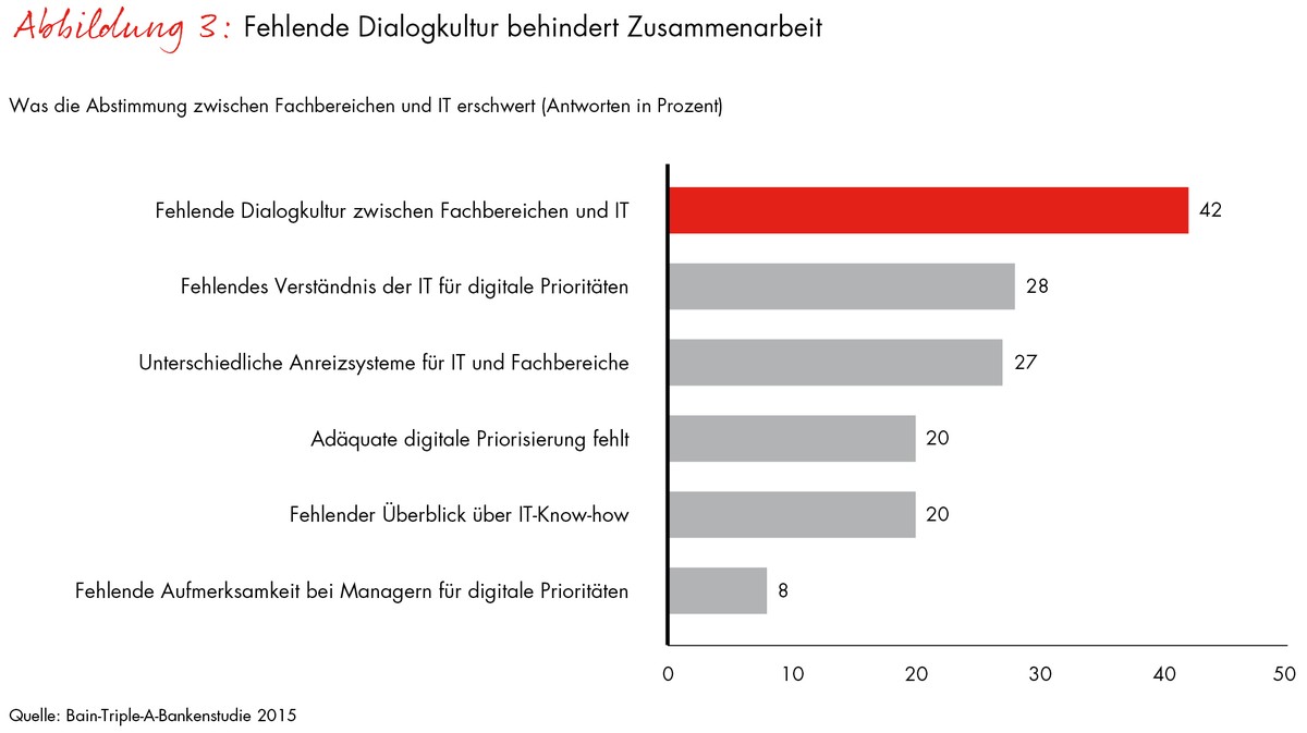 Ein wichtiger Baustein bei der digitalen Transformation ist der Abgleich der IT-Prioritäten mit der Gesamtstrategie einer Bank. Dies gelingt nur rund 40 Prozent der größeren Kreditinstitute vollständig und über Jahre hinweg konsistent. Die befragten Manager begründen Diskrepanzen vor allem mit fehlender Dialogkultur zwischen den Fachbereichen und der IT sowie dem mangelnden Verständnis der eigenen Mannschaft für die digitalen Prioritäten des Unternehmens (Abb. 3).