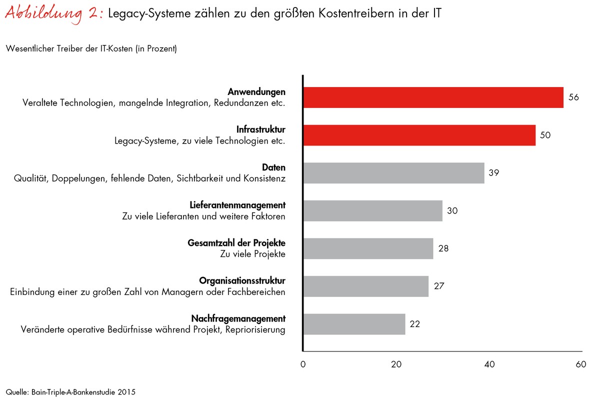 Die Kunden erwarten zunehmend ein digitales, voll integriertes Kundenerlebnis – und das stets auf dem neuesten Stand der Technik. Mit diesem rasanten Wandel können bislang nur einige Vorreiter mithalten (Abb. 1). Zahlreiche IT-Manager hingegen kämpfen aufgrund knapper Budgets mit veralteten Systemen und Anwendungen (Abb. 2). Darüber hinaus erfordern die höhere Komplexität des operativen Geschäfts sowie die verschärfte Regulierung umfangreiche Anpassungen der bestehenden IT.