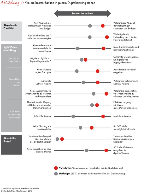 „Die Banken brauchen einen Neustart der IT, um die Kluft zwischen der Ist-Situation und den Erwartungen der Kunden im digitalen Zeitalter zu überwinden“, erklärt Ingolf Zies, Partner bei Bain & Company und Autor der Studie. „Die derzeitigen Ansätze, neue digitale Lösungen in bestehende Systeme zu integrieren, greifen oft zu kurz.“ Die IT ist das Herzstück einer digitalisierten Bank und damit ein strategisches Instrument, kein technisches Thema. Die Prioritäten eines Hauses müssen für die IT übersetzt und vor allem budgetiert werden. Nur so gelingt es, den Umbau voranzutreiben.