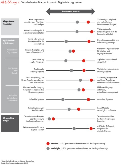Erfolgreiche Kreditinstitute stellen drei zentrale Themen in den Mittelpunkt: Sie stimmen die IT-Prioritäten umfassend mit ihrer Gesamtstrategie ab, setzen konsequent auf die agile Weiterentwicklung neuer Applikationen und Dienste und achten dabei auf ein für sie nachhaltig akzeptables Budget. „Schon heute sollten Banken bis zur Hälfte ihres IT-Budgets für digitale Projekte verwenden“, so Bain-Experte Zies. „Denn ohne eine digitale Transformation und ohne deren fundierte Einbindung in die Unternehmensstrategie verlieren sie den Anschluss an die Konkurrenz und geraten selbst gegenüber Branchenneulingen ins Hintertreffen.“
