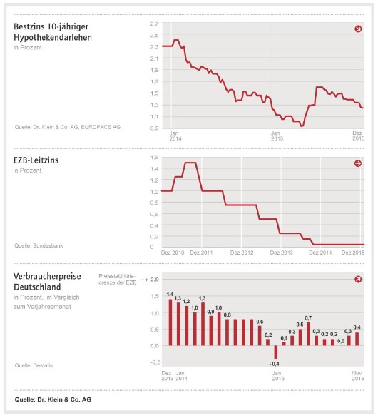 Generell kann mit Blick auf das Jahresende 2015 festgehalten werden, dass die Eigenheimfinanzierer in Deutschland trotz aller kurzfristigen Schwankungen ein extrem niedriges und damit historisch einzigartiges Zinsniveau vorfinden. Zum ersten Mal seit Jahren ist das gesamte Immobilienfinanzierungsvolumen, das die Bundesbank statistisch ermittelt, stark angestiegen. Dies liegt zum Teil an kräftig steigenden Immobilienpreisen in verschiedenen Metropolregionen, vermehrten Immobilienkäufen und zunehmend auch an einer sich deutlich belebenden Baukonjunktur in Deutschland.