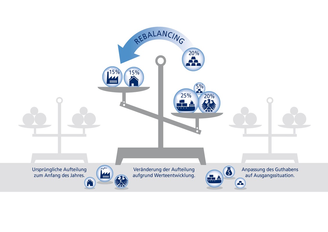 Rebalancing für eine ausgewogene Struktur des Anlageportfolios Der neue Sicherheitsmechanismus Rebalancing gilt sowohl für Neu- als auch Bestandskunden. Gebührenfrei wird automatisch einmal pro Versicherungsjahr eine Umschichtung der Kapitalanlagen vorgenommen, um die zuletzt vereinbarte Anlagestruktur wiederherzustellen. Deren Gewichtung kann sich im Zeitverlauf durch Wertschwankungen der einzelnen Fonds im Gesamtportfolio verändern, wodurch das Portfolio risikobehafteter und schwankungsanfälliger werden kann.