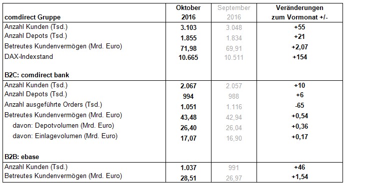 Die Kundengesamtzahl der comdirect Gruppe betrug Ende Oktober 3,103 Mio. (September: 3,048 Mio.). Es wurden 1,855 Mio. Wertpapierdepots geführt (September: 1,834 Mio.), und das betreute Kundengesamtvermögen lag im Oktober bei 71,98 Mrd. Euro (September: 69,91 Mrd. Euro).