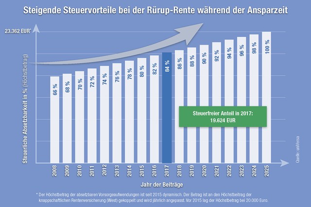 Zum 1. Januar haben sich die Rahmenbedingungen bei der Rürup-Rente verbessert: Steuerlich abzugsfähig als Sonderausgaben sind jetzt 84 Prozent (Vorjahr 82) bis zu einem Höchstbetrag von 23.362 Euro (Vorjahr 22.766). Damit können in diesem Jahr bis zu 19.624 Euro für Vorsorgeaufwendungen geltend gemacht werden – bei Verheirateten sogar 39.248 Euro.