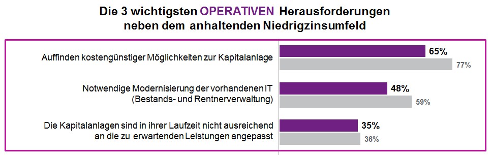 Wichtigste operative Herausforderungen für Pensionskassen (neben dem anhaltenden Niedrigzinsumfeld) – aktuelle Angaben (lila) im Vergleich zum Vorjahr (grau).