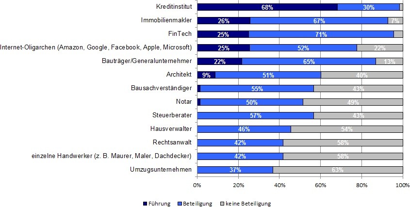 Dass Kreditinstitute Teil eines digitalen Ökosystems zur Erfüllung des Kundenwunsches „Immobilienerwerb“ sein werden, ist in den Augen der Experten (fast) sicher. Über zwei Drittel der Befragten sind zudem der Meinung, dass eine Bank oder eine Sparkasse auch die Führung darin übernehmen wird. Anderen Unternehmensgruppen wird diese Rolle weit weniger häufig zugetraut: als potenzielle Leiter eines Ökosystems sehen ca. ein Viertel der Experten Immobilienmakler (26 %), FinTechs (25 %), Internet-Oligarchen (25 %) oder Bauträgern/Generalunternehmern (22 %). Weiteren Berufsgruppen wie z. B. Bausachverständigen, Notaren oder Steuerberatern wird diese Rolle nicht zugerechnet; auch mit ihrer Beteiligung rechnen nur rund 50 % der Experten. Die Beteiligung weiterer Unternehmen aus den Branchen Hausverwaltung, Handwerk und Umzugsdienstleistung wird noch weitaus geringer eingeschätzt.