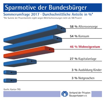 Das Sparmotiv „Wohneigentum“ ist das einzige, das in der Gunst der Deut-schen im Sommer 2017 zulegen konnte. Klarer Verlierer: das Sparen für spä-teren „Konsum“. Das ist das wesentliche Ergebnis der Sommerumfrage 2017 zum Sparverhalten der Deutschen. Kantar TNS befragte dazu im Auftrag des Verbandes der Privaten Bausparkassen bereits zum 60. Mal über 2.000 Bundesbürger im Alter von über 14 Jahren.