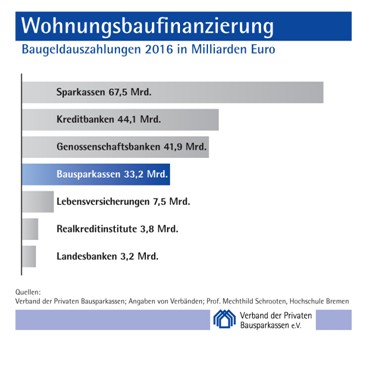 Auf die Sparkassen entfielen 2016 dabei 67,5 Milliarden Euro; das entspricht einem Marktanteil von 33,2 Prozent. Die Kreditbanken kamen auf geschätzte 44,1 Milliarden Euro und einem Marktanteil von 21,9 Prozent. Fast in der gleichen Größenordnung bewegten sich die Genossenschaftsbanken mit geschätzten Baugeldauszahlungen von 41,9 Milliarden Euro und einem Marktanteil von 20,8 Prozent. Die Bausparkassen verbuchten 33,2 Milliarden Euro und erreichten damit einen Marktanteil von 16,5 Prozent.