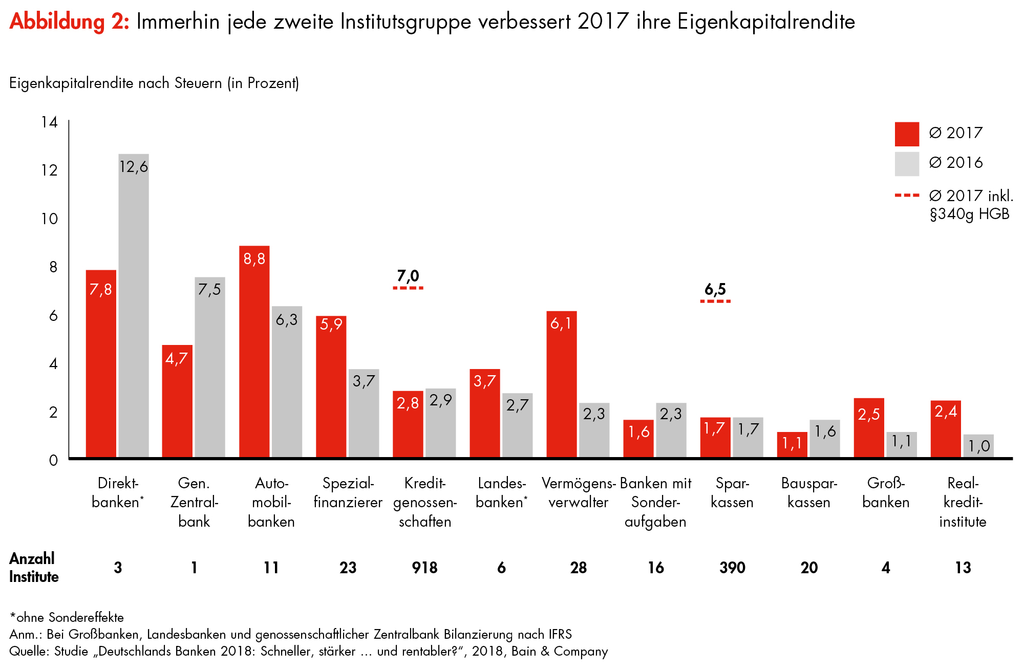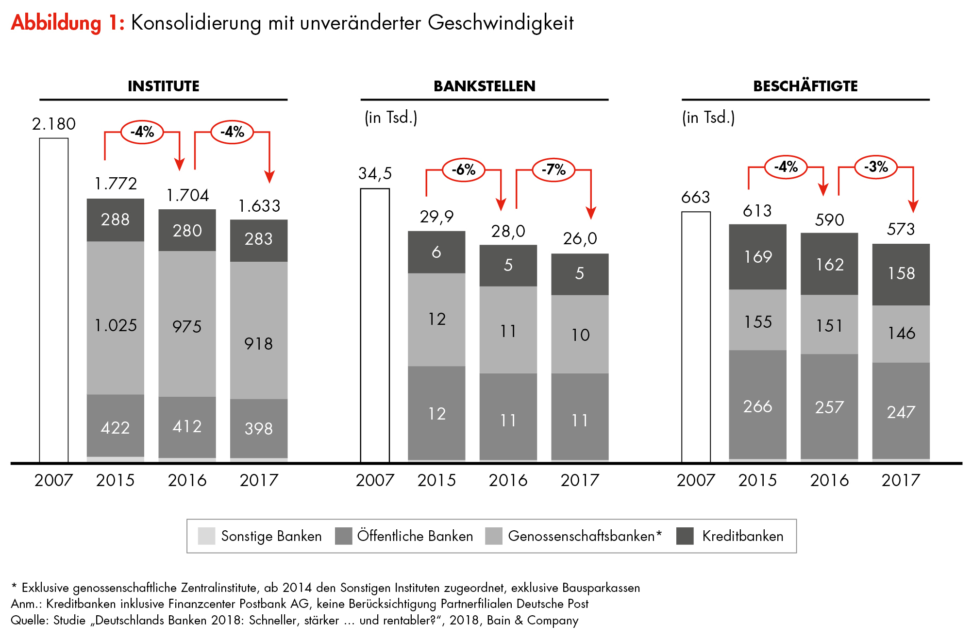 Zum fünften Mal wertet Bain & Company die Bilanz- und GuV-Strukturen der deutschen Kreditinstitute aus, insgesamt gab es 2017 noch gut 1.630 Banken. Die Experten nutzen dazu Zeitreihen der Deutschen Bundesbank, der Europäischen Zentralbank sowie der Datenbanken von Bankscope, Hoppenstedt, Capital IQ und SNL. Der Zuschnitt der Institutsgruppen orientiert sich an der Klassifizierung der Deutschen Bundesbank.