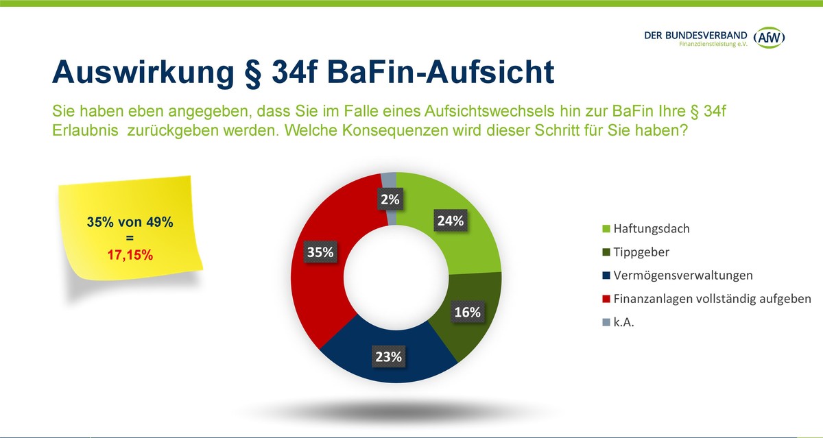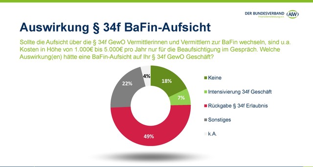 Die BaFin finanziert sich über ein Umlageverfahren bei den beaufsichtigten Personen und Unternehmen. Der AfW rechnet bei einem Aufsichtswechsel zur BaFin mit Kosten in Höhe von 1.000 bis 5.000 Euro pro Zulassungsinhaber und Jahr allein für die Beaufsichtigung. Befragt nach den Konsequenzen antwortete knapp die Hälfte der betroffenen Finanzanlagevermittler (49 Prozent), dass sie nicht bereit wären diese Kosten zu tragen und daher ihre Erlaubnis zurückgeben würden. Lediglich 7 Prozent würden das Finanzanlagegeschäft intensivieren.