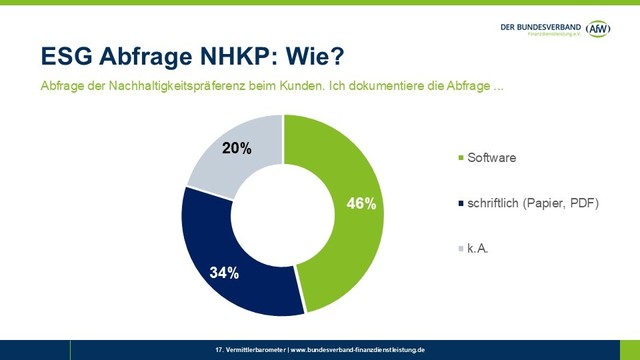 Neben der kritischen Haltung zur Einstufung von Rüstungsgütern zeigt die Umfrage auch Entwicklungen bei der praktischen Umsetzung der ESG-Abfragepflichten. Immer mehr Vermittler setzen auf technische Unterstützung: Der Anteil derjenigen, die ein IT-Tool nutzen, stieg von 42 Prozent im Vorjahr auf nunmehr 46,3 Prozent. Dagegen sank der Anteil derjenigen, die ESG-Präferenzen über PDF oder Papierdokumente erheben, von 38 auf 33,5 Prozent.