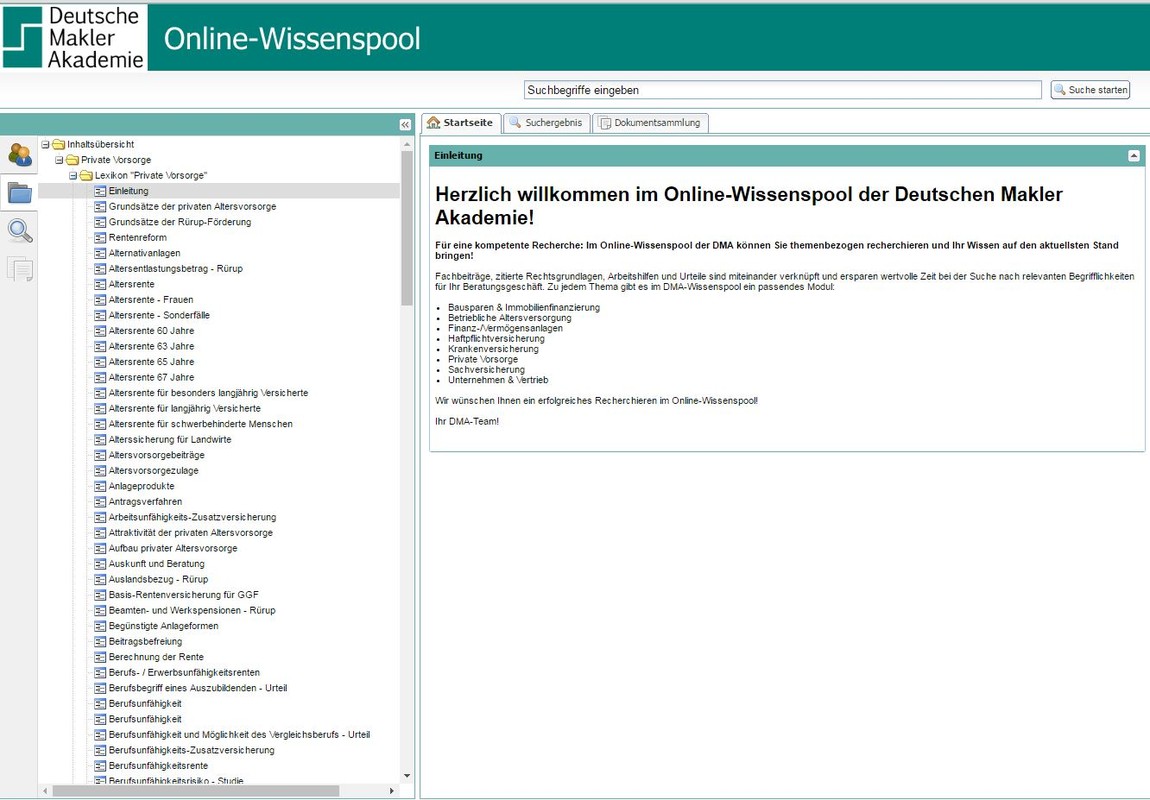 Sehr umfangreich ist zudem der Online-Wissenspool auf der Website www.deutsche-makler-akademie.de. In einem Nachschlagewerk mit Lose-Blatt-Informationen werden neben diversen Fachthemen auch aktuelle Gesetzestexte, Gerichtsurteile und Kalkulationsgrundlagen geboten. Zur unkomplizierten Recherche ist eine themenbezogene Suchfunktion integriert. Durch die Verknüpfung der zahlreichen Informationen wird dem Teilnehmer wertvolle Zeit bei der Suche nach relevanten Begrifflichkeiten für sein Beratungsgeschäft erspart.