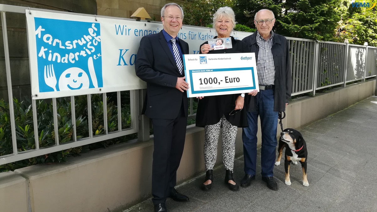 Anlässlich des 20-jährigen Jubiläums der VEMA eG, des größten genossenschaftlich organisierten Verbundes von Versicherungsmaklern in Deutschland, wurde von dessen langjährigem Kooperationspartner, der Gothaer Versicherung, am 26.04. ein symbolischer Scheck über 1.000 Euro für den Karlsruher Kindertisch e. V. übergeben.