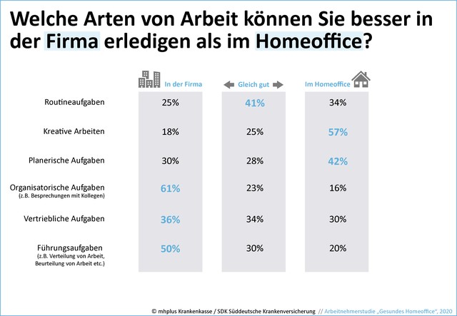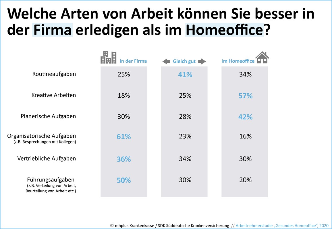 Die Produktivität im Homeoffice wird von jedem zweiten Befragten als Schwachpunkt eingestuft. Dabei gibt es aber einen deutlichen Unterschied, ob jemand bereits Erfahrung als Heimarbeiter sammeln konnte oder nicht. Knapp 60 Prozent derjenigen, die noch nie oder erst zur Coronakrise im Homeoffice saßen, gehen davon aus, dass die Arbeit im Büro produktiver ist. Bei denjenigen, die bereits längere Zeit zuhause arbeiten, sind es nur 44 Prozent. „Diese Vorbehalte von Seiten der Unternehmen und der Angestellten zur Produktivität im Homeoffice können mit der richtigen Unterstützung jedoch schnell abgebaut werden“, hat Sarah Löder beobachtet. Die Fachberaterin für Betriebliche Gesundheitsförderung bei der mhplus Krankenkasse betont daher: „Arbeitgeber und Arbeitnehmer sollten gerade für die aktuellen Herausforderungen entwickelte Angebote zur Betrieblichen Gesundheitsförderung nutzen, um die Produktivität, die Gesundheit sowie die Zufriedenheit der Beschäftigten zu erhalten und zu fördern.“