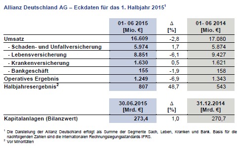 Die Allianz Deutschland AG hat sich im ersten Halbjahr 2015 in einem anspruchsvollen Marktumfeld gut behauptet. Der Umsatz sank wie erwartet leicht um 2,8 Prozent auf 16,6 (1. Halbjahr 2014: 17,1) Milliarden Euro. Dies ist auf eine Verschiebung des Neugeschäftes in der Lebensversicherung von Einmalbeiträgen zu laufenden Beiträgen zurückzuführen. Die Sachversicherung setzte ihren Wachstumskurs fort. Das operative Ergebnis der Allianz Deutschland fiel um 6,9 Prozent auf 1,2 (1,3) Milliarden Euro, unter anderem aufgrund von Belastungen durch das Sturmereignis "Mike/Niklas". Das Halbjahresergebnis stieg auf 807 (543) Millionen Euro. Das Ergebnis im Vorjahreszeitraum war durch einen Sondereffekt belastet.