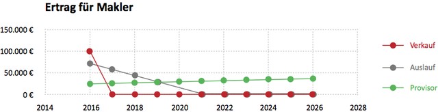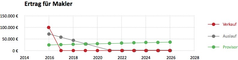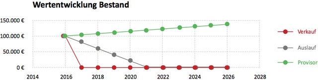 Beispielrechnung der Wertentwicklung eines Bestands mit einem Verkaufswert von 105.000 € bei Verkauf, Auslauf oder Vermietung an Provisor