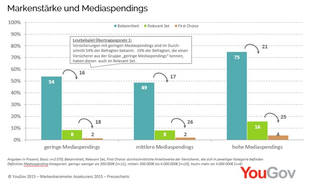 Versicherer mit insgesamt geringen Aufwendungen für Werbung (weniger als 0,5 Mio. Euro von Januar bis Juni 2015; Quelle: Ebiquity) weisen eine durchschnittliche Übertragungsrate 1 von der Bekanntheit in das Relevant Set von nur 16 Prozent auf und eine Übertragungsrate 2 vom Relevant Set auf First Choice von 18 Prozent. Versicherer mit mittleren Gesamtspendings (0,5 bis 4 Mio. Euro) können zwar mit durchschnittlich 17 Prozent nicht die Übertragungsrate 1 verbessern, jedoch wirken sich die höheren Spendings positiv auf die Übertragungsrate 2 aus, die auf 26 Prozent gesteigert werden kann. Bei den Versicherern mit den höchsten Spendings (mehr als 4 Mio. Euro) kann zudem die Übertragungsrate 1 gesteigert werden. Immerhin 21 Prozent der Kenner nehmen diese Marken auch in ihr Relevant Set.