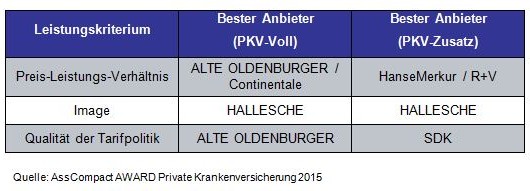 Obwohl die ALTE OLDENBURGER im Ranking der PKV-Vollversicherung nur den 8. Platz belegt, zählt sie beim Leistungskriterium „Qualität der Tarifpolitik“ zu den Gewinnern. Zudem teilt sie sich mit der Continentale das beste wahrgenommene „Preis-Leistungs-Verhältnis“. Das beste „Image“ genießt die HALLESCHE. Im Zusatzgeschäft wird der SDK die höchste „Qualität der Tarifpolitik“ zugeschrieben. Das „attraktivste Preis-Leistungs-Verhältnis“ teilen sich die HanseMerkur und die R+V.