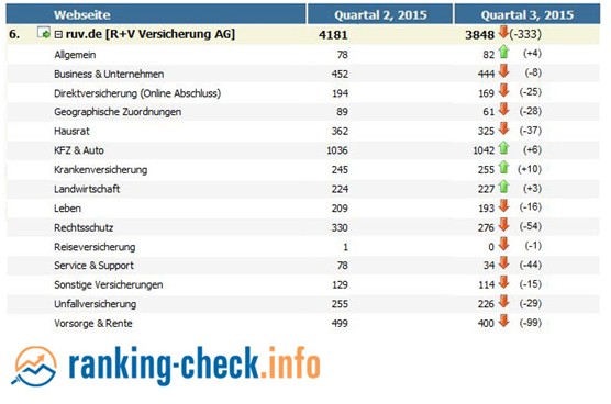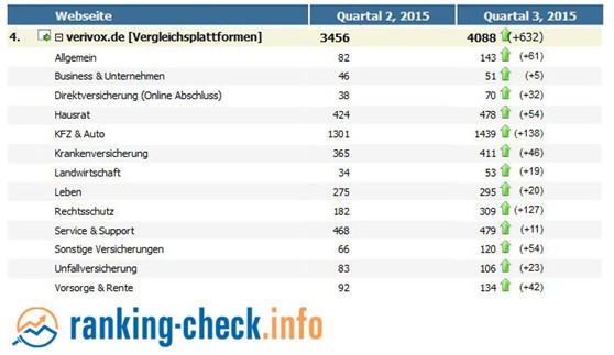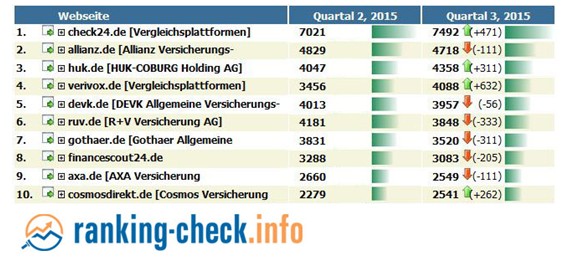 Eine Auswertung der Suchmaschinen-Platzierungen der deutschen Versicherer von ranking-check.info zeigte ein deutliches Erstarken der Vergleichsplattformen. So konnte check24.de den ohnehin hohen Abstand auf die Konkurrenz aus der Versicherungsbranche - Allianz, HUK-Coburg, DEVK, R+V und Gothaer – noch weiter ausbauen.