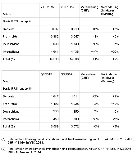 Verbuchte Bruttoprämien, Policengebühren und erhaltene Einlagen per 30. September 2015