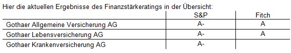 Die internationale Rating-Agentur Standard & Poor’s (kurz „S&P“) hat am 4. Dezember die Rating-Ergebnisse der Kerngesellschaften des Gothaer Konzerns bestätigt. Die Gothaer Allgemeine Versicherung AG, die Gothaer Lebensversicherung AG und die Gothaer Krankenversicherung AG werden weiterhin mit ’A-’ und einem stabilen Ausblick eingestuft.