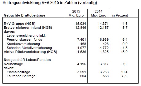 R+V Gruppe 2015: Erneut Rekordwachstum trotz Niedrigzinsumfeld und Verdrängungswettbewerb – Beitragsplus von 4,6 Prozent auf 15,0 Milliarden Euro – Beiträge, Kundenzahl und Verträge in allen Sparten gesteigert