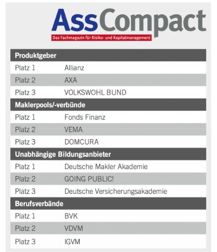 Die Favoriten der Weiterbildungsanbieter pro Kategorie; Quelle: bbg Betriebsberatungs GmbH, Studie AssCompact TRENDS II/2016.