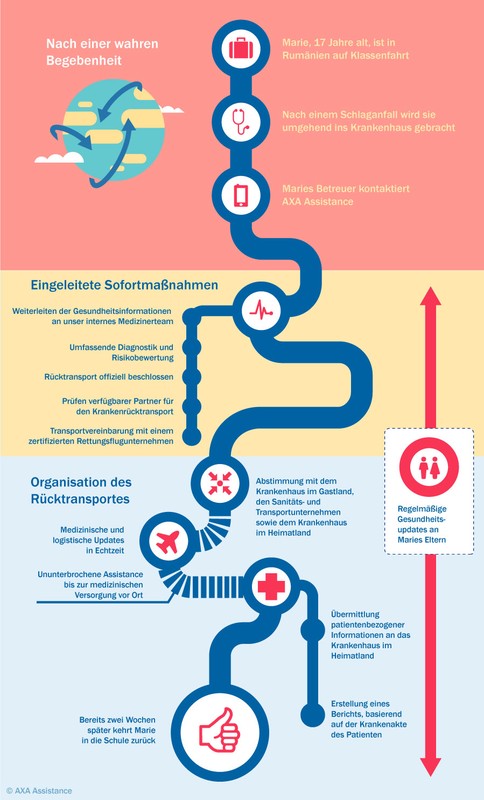 Infografik zum Rücktransport: Wer hilft, wenn man im Urlaub krank wird - AXA Assistance empfiehlt Auslandskrankenversicherung für die Urlaubsreise
