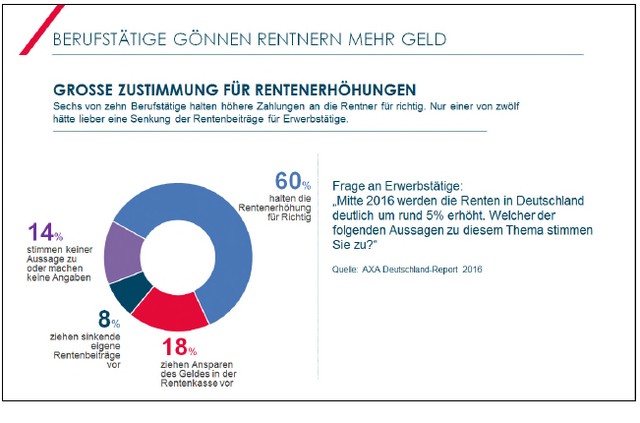 Die große Mehrheit der Berufstätigen gönnt den Rentnern die heute in Kraft getretene deutliche Rentenerhöhung von 4,25 Prozent in Westdeutschland und 5,95 Prozent in den neuen Bundesländern. Das geht aus einer Erhebung der AXA Lebensversicherung in Köln hervor: 60 Prozent der Berufstätigen halten demnach die steigenden Renten für richtig.