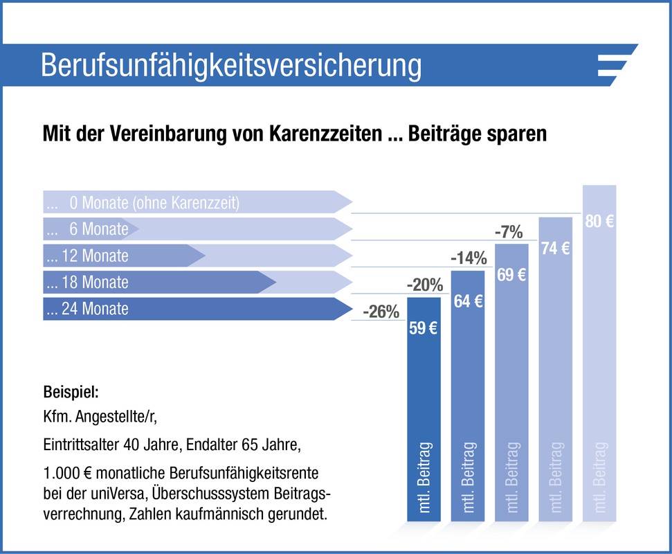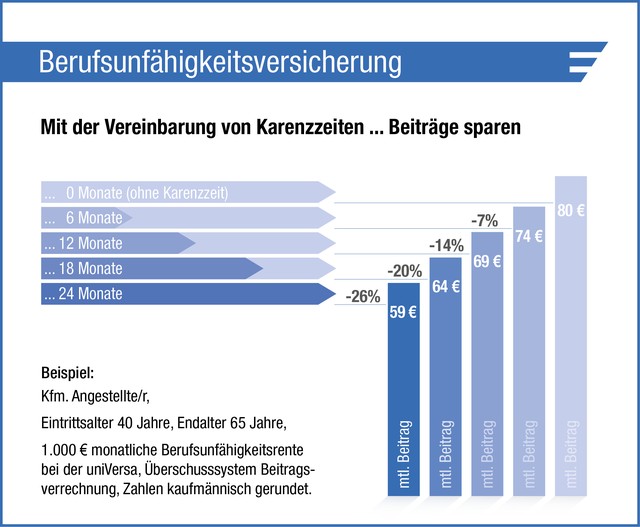 Im Ernstfall muss das Geld ausreichen, um die monatlichen Lebenshaltungskosten und Abbuchungen bis zum geplanten Altersrentenbeginn bezahlen zu können. Wer Beiträge sparen möchte, kann bei einigen Anbietern eine Karenzzeit vereinbaren. Bei der uniVersa sind zum Beispiel sechs, zwölf, 18 und 24 Monate möglich. Die Berufsunfähigkeitsrente wird dann erst nach Ablauf der vereinbarten Karenzzeit bezahlt. Ein 40-jähriger kaufmännischer Angestellter, der beispielsweise eine Berufsunfähigkeitsrente über 1.000 Euro bis Endalter 65 bei der uniVersa abschließen möchte, kann damit seinen monatlichen Beitragsaufwand je nach Karenzzeit zwischen sieben und 26 Prozent reduzieren. Hochgerechnet spart er sich dadurch bis zu 6.300 Euro an Beiträgen. Allerdings muss man sich auch im Klaren darüber sein, dass im Ernstfall – also bei Eintritt der Berufsunfähigkeit – die monatliche Absicherung während der Karenzzeit aus eigenen Rücklagen finanziert werden muss, erläutert die uniVersa. Die Beiträge zur Berufsunfähigkeitsversicherung brauchen während der Karenzzeit nicht weitergezahlt werden, da die Beitragsfreistellung unabhängig davon ab Eintritt der Berufsunfähigkeit greift.