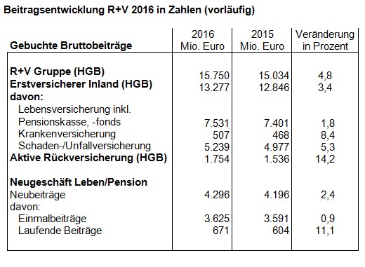 Im inländischen Erstversicherungsgeschäft kletterten die Beiträge der R+V Gruppe 2016 um 3,4 Prozent auf 13,3 Milliarden Euro. Insgesamt verzeichnete die R+V Gruppe einen Zuwachs von 4,8 Prozent auf insgesamt 15,8 Milliarden Euro.