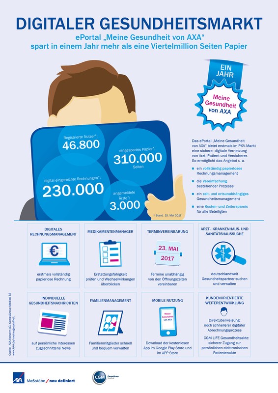 Mit dem ePortal „Meine Gesundheit von AXA“ setzen AXA und CGM seit einem Jahr erfolgreich neue Maßstäbe im deutschen PKV-Markt und bieten digitale Services, die bereits heute den Anforderungen des E-Health-Gesetzes entsprechen. Darüber hinaus belegen die Unternehmen, dass die kundenorientierte Digitalisierung des Gesundheitswesens zahlreiche Vorzüge für alle Beteiligten bietet und von PKV-Kunden sowie Ärzten genutzt wird.