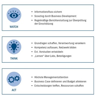 Die Bewertung der Digitalisierungstrends sollte in den drei Dimensionen Potenzial, Umsetzungsaufwand und Reifegrad der Technologie erfolgen. Auf Basis der Bewertungsergebnisse können dann für jeden Trend Handlungsoptionen abgeleitet werden. Diese Handlungsoptionen heißen Act, Think sowie Watch und erfordern ein unterschiedlich starkes Commitment von Ressourcen und Managementattention (vgl. Grafik 2).