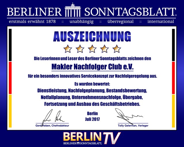 Auch kommt die Auszeichnung zu einem günstigen Zeitpunkt. Hat der Makler-Nachfolger-Club e.V. doch jüngst seine vierte „Botschaft“ als Repräsentanz in Berlin eröffnet und ist jetzt neben den Standorten Konstanz, Stuttgart und Gundelsheim (bei Bamberg) nun auch in der Hauptstadt vertreten.