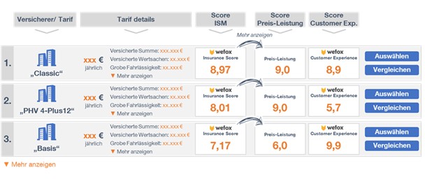 Um Maklern eine möglichst hohe Entscheidungsfreiheit an die Hand zu geben, werden im wefox Insurance Score Rating der Gesamt-Score, der reine Preis-/Leistungsscore sowie das wefox Customer Experience Rating als separate Kennzahlen zur Verfügung gestellt. Im Beispielfall sieht der Makler, dass der „Classic“ Tarif (PHV) des Versicherungsunternehmens VU 1 einen Gesamt-Score von 8,97 erhält. Sobald der Makler auf den Score klickt, öffnen sich für ihn die Felder zum Score Preis-Leistung (hier: 9,0) sowie Customer Experience (hier: 8,9). Darüber hinaus erhält der Makler detaillierte Informationen zu den einzelnen Scores. Der Makler kann ein auf seinen Kunden passendes Produkt bei einer passenden Versicherungsgesellschaft finden. Makler haben dadurch die Möglichkeit, besser auf einzelne Kundenbedürfnisse hinsichtlich einzelner Hauptkriterien einzugehen und können dadurch eine höhere Kundenloyalität erreichen.