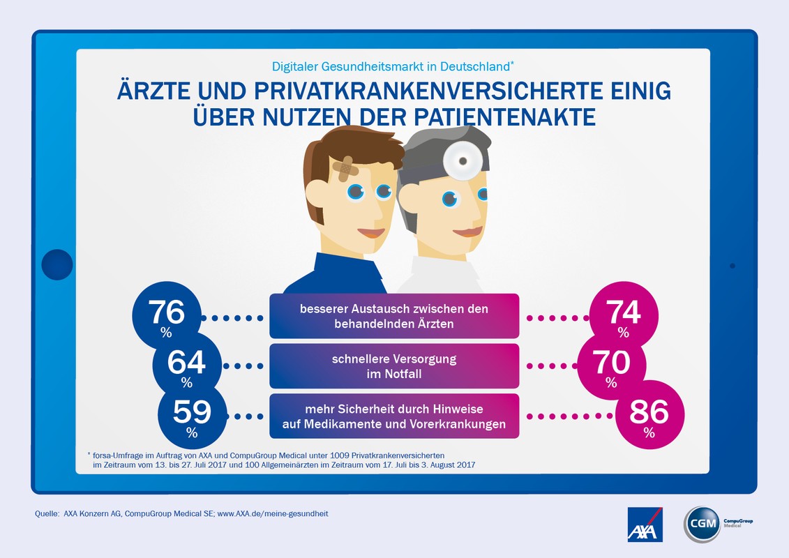 „Diese positiven Ergebnisse bestätigen uns in dem Schritt, den wir kürzlich mit der Bereitstellung einer elektronischen Patientenakte im ePortal ‚Meine Gesundheit von AXA‘ für unsere Kunden gegangen sind“, erklärt Klaus Dombke. „Nun hat jeder unserer krankenvollversicherten Kunden die Möglichkeit, über das ePortal kostenfrei auf seine eigene digitale Akte zuzugreifen. Aktuell können unsere Kunden hier eigenständig ihre Dokumente einstellen, verwalten und archivieren. Künftig wird es auch möglich sein, vom Arzt hochgeladene Dateien einzusehen, vorausgesetzt der Versicherte hat seinem Arzt den Zugang zur Akte gewährt. Die Kunden können somit ihre ganz private digitale Gesundheitsakte anlegen, in der alle persönlichen und medizinischen Dokumente sowie auch Notfalldaten sicher abgelegt und jederzeit greifbar sind.“