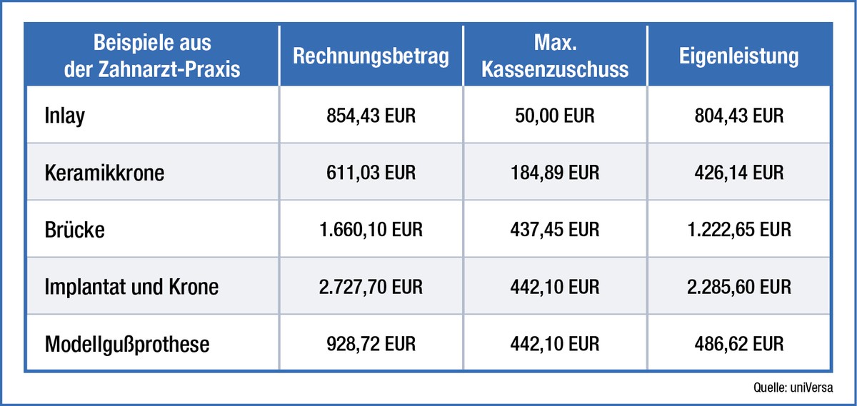 Die uniVersa hat zur Zahnzusatzversicherung eine neue Beratungshilfe herausgebracht. Darin sind verschiedene Kosten- und Leistungsbeispiele aus der täglichen Regulierungspraxis anschaulich dargestellt.
