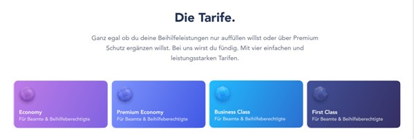 Der Einsteiger-Tarif „Economy Class“ beinhaltet einen guten Basisschutz mit den Grundbausteinen „Stationär“ sowie „Ambulant & Zahn“. In dem Tarif „Premium Economy Class“ ist die Basisabsicherung durch Zusatzbausteine ergänzt, die weitere Leistungen für Zahnersatz, Kieferorthopädie und Gnathologie beinhalten. Weiterhin sind bis zu sechs Monate ambulante und stationäre Heilbehandlung bei Auslandsreisen, Rücktransport und Überführungskosten sowie Sonderleistungen für pflegebedürftige und schwersterkrankte Kinder und Jugendliche enthalten. Im Tarif „Business Class“ kommen zudem Wahlarztbehandlungen sowie ein Zweibettzimmer bei stationärem Klinikaufenthalt hinzu. Der „First Class“ Tarif beinhaltet zusätzlich nicht beihilfefähige Arznei-, Verbands- und Hilfsmittel sowie ein Einbettzimmer bei stationärem Aufenthalt für die ideale Rundumversorgung.