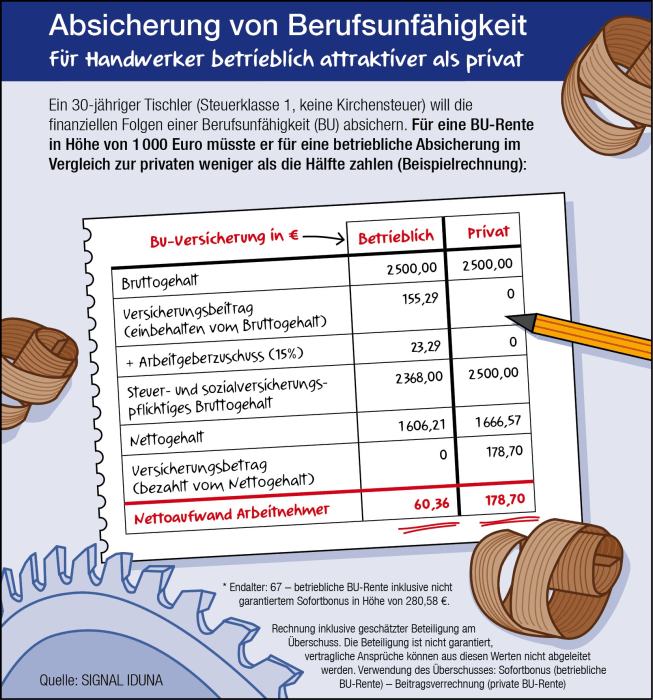 SIGNAL IDUNA hat berechnet, was eine betriebliche BU für einen Tischler kostet. Für eine Rente in Höhe von 1.000 Euro müsste ein Tischler beispielsweise statt 179 Euro lediglich 97 Euro im Monat zahlen – dank Sozialabgaben- und Steuerbefreiung. Noch attraktiver wird die betriebliche BU-Absicherung, wenn der Chef zusätzlich einen Zuschuss zum Beispiel in Höhe der eingesparten Sozialversicherungsbeiträge zahlt. Dann bleiben für den Arbeitnehmer in dem Beispiel lediglich etwa 60 Euro übrig. Hinzu kommt, dass meist nur eine vereinfachte Gesundheitsprüfung nötig ist.