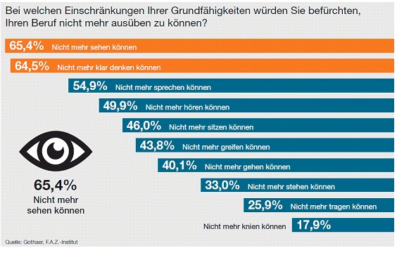 „Psychische Erkrankungen sieht jeder zweite Berufstätige als Risiko, seinen bisherigen Beruf nicht mehr ausüben zu können – das deckt sich auch mit unseren Erfahrungen. Diese Sorge müssen wir als Versicherer ernst nehmen. Hier sind wir gefragt, nicht erst im Leistungsfall tätig zu werden, sondern auch schon im Sinne von Prävention unseren Kunden Angebote zu machen“, so Maike Gruhn, Leiterin Produkt- und Innovationsmanagement bei der Gothaer. Vor allem Menschen im Bereich Wissenschaft, Unterricht, Beratung sowie Personen in medizinischen Berufen stufen psychische Erkrankungen als existenzielles Risiko für die eigene Arbeitsfähigkeit ein.